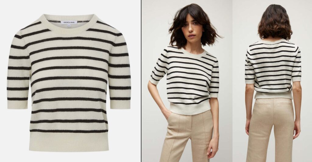 In the new family photo, it appears the Princess is wearing a top by Veronica Beard, the US-based label’s ‘Shana’ Cashmere Sweater (now sold out) in off-white with black stripes. The style is 100% cashmere, described as having “a slightly cropped body and elongated short-sleeves—enhanced by fine ribbing at the collar, cuffs and hem.”